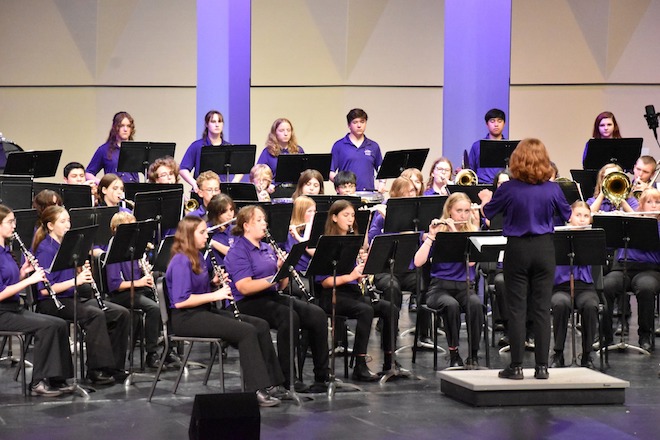 Oct. 24 Herald – Members of the marching band at Hononegah High School take the school’s stage in their recent performance for family, friends and fans. (Hononegah School District photo)