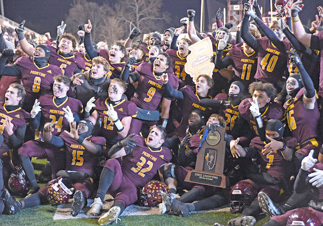 (Lombardian, Dec. 4) Several members of Montini Catholic High School’s football team are pictured with the IHSA Class 4A state-championship trophy after the Broncos defeated Rochester 47-33. (Chris Fox photo)