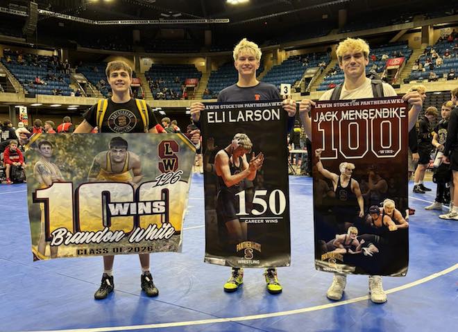 The Scoop Today Jan. 7 – The Lena-Winslow-Stockton PantherHawks earned second-place at the tourney in Springfield. Career wins were celebrated by Brandon White (100), Eli Larson (150), and Jack Mensendike (100). (Team photo)