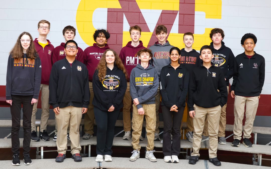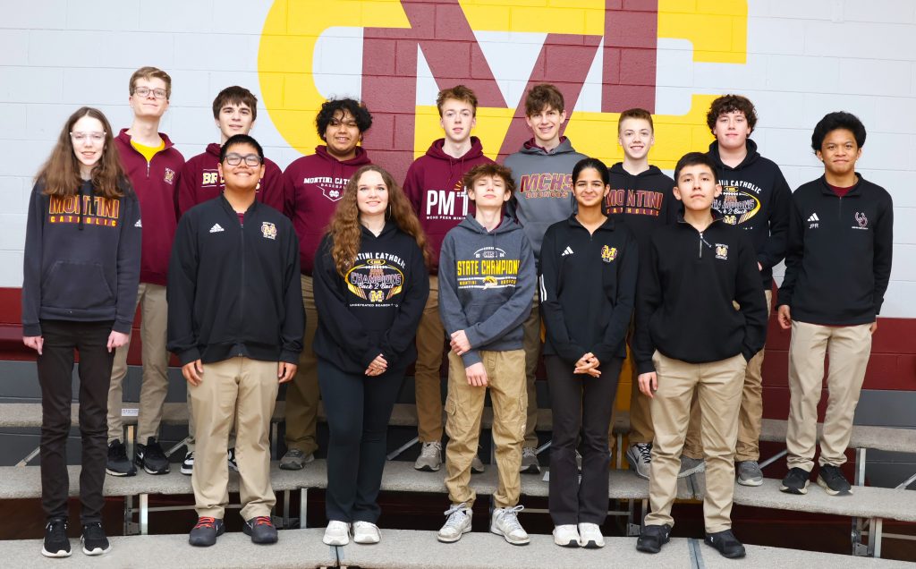 Montini robotics team members (both teams) include, front row (left to right): junior Molly Felice, sophomore Aidan Buhey, junior Brianna Konopacz, freshman Zach Yount, freshman Anya Dhir and freshman Alexander Rivera. Back row: sophomore Evan Aumann, sophomore Blake Morton, sophomore Thomas Salem, junior Gavin Conway (Lombard), junior Lucas VanWitzenburg, freshman Benjamin Conway (Lombard), junior Franklin Barnes and junior Julian Reyes.
