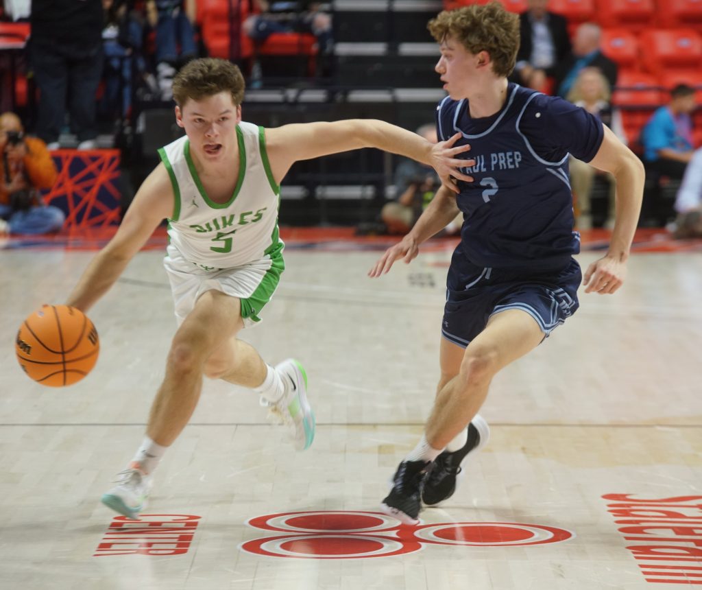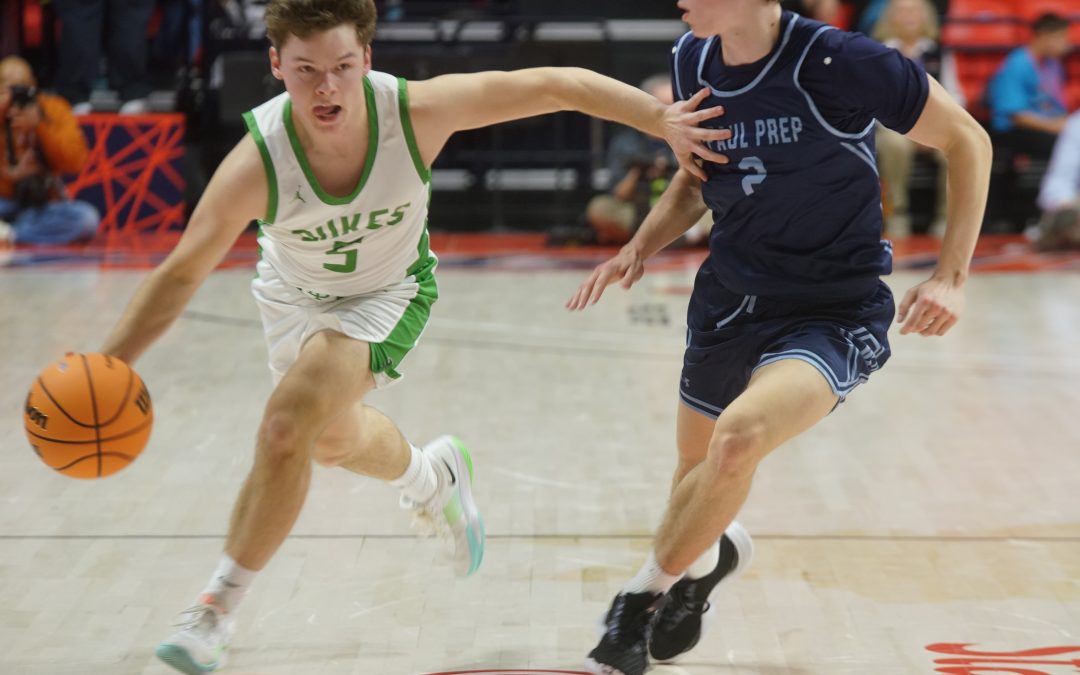 York senior guard Carter Herron dribbles around DePaul College Prep’s Pat Lovell during the third place game. Herron helped York finish fourth among Illinois High School Association Class 4A Teams. It was the first state trophy York collected in its history.