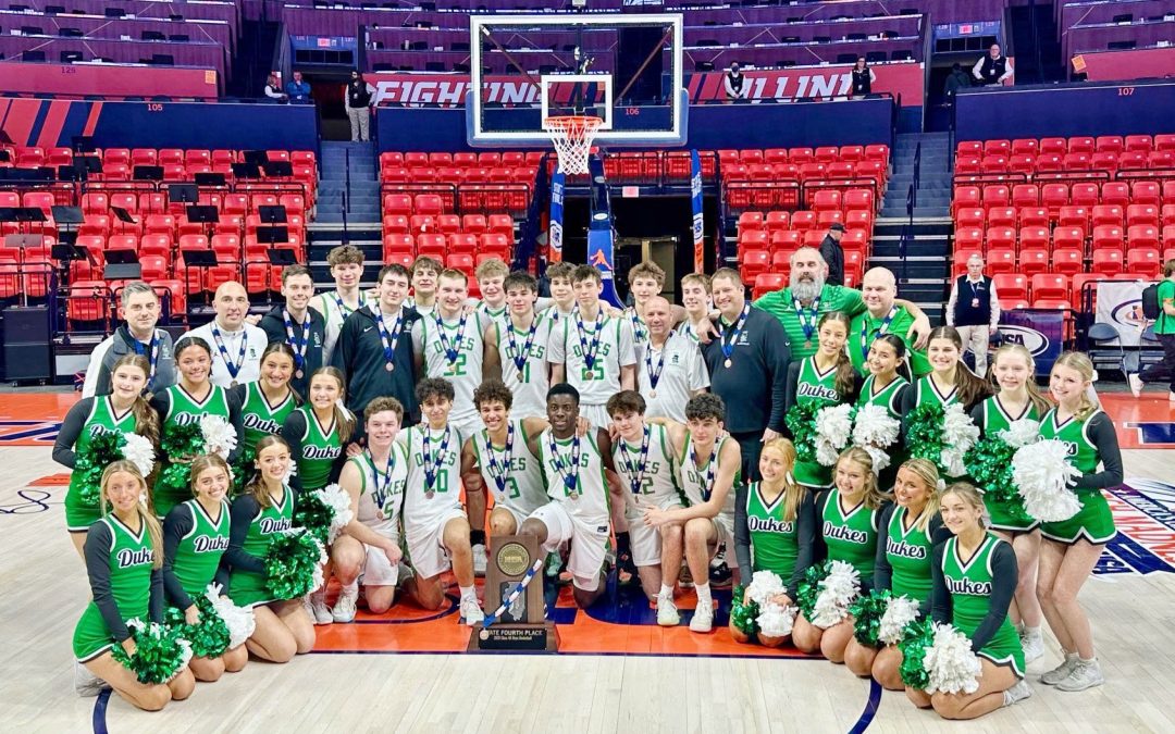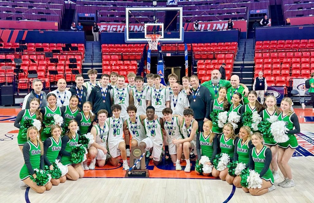 York High School’s boys basketball players and the York cheerleaders are pictured after the Dukes claimed the fourth-place trophy at the IHSA Class 4A boys basketball state tournament in Champaign. (YORK BOYS BASKETBALL/TWITTER PHOTO)